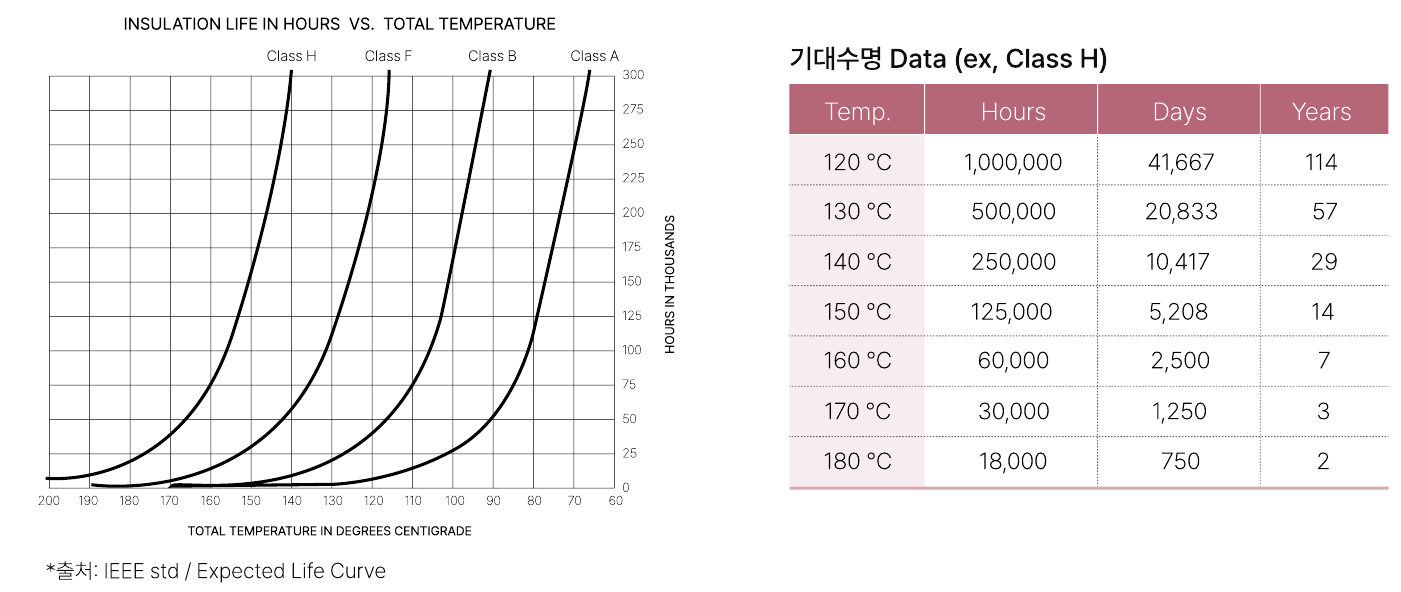 'IEEE 절연 열화 모델(Class H, 180 °C 기준)' 을 근거로 평가되며,
