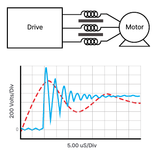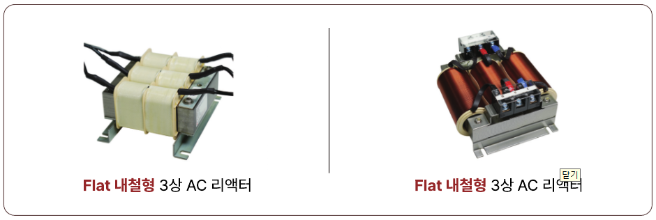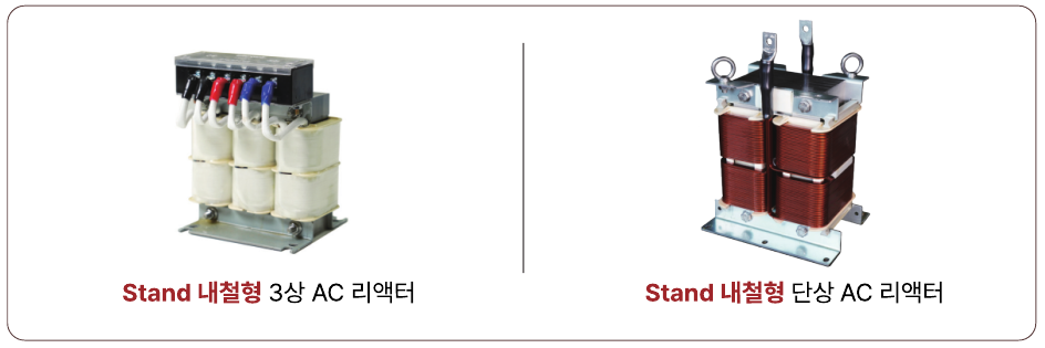 AC 단상 리액터는 3상 정류회로의 1차측 교류 회로에 적용되어 파형을 매끄럽게 만들고, 역률 개선 및 고조파 억제 역할을 합니다.